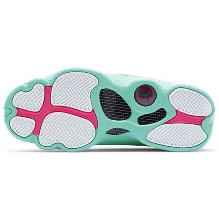 The (GS) Air Jordan 13 Retro ‘Aurora Green’ 439358-100 (model number 439358) was released on May 07, 2020. Part of the Air Jordan 13 High series, this sneaker features a regular sole thickness and a leather upper for a premium look and feel. It uses a traditional lacing system and is built on a durable rubber sole. Designed as a high top with a round, it’s ideal for lifestyle wear. In terms of functionality, the shoe is cushioning, slip-resistant, wearable, making it suitable for every day wear all season. The main color is White, and the official colorway is White/Soar/Aurora Green/Digital Pink.