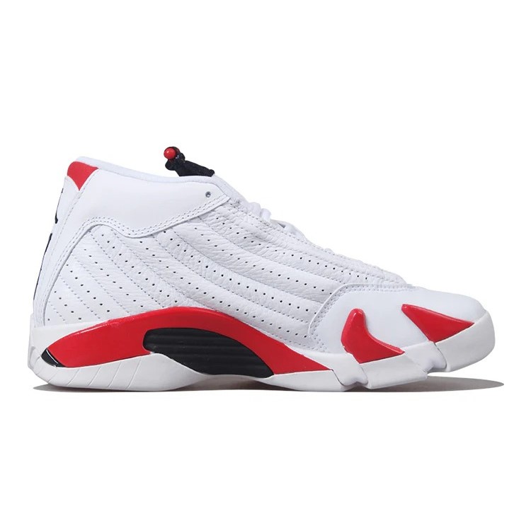 The (GS) Air Jordan 14 Retro ‘Candy Cane’ 2019 487524-100 (model number 487524) was released on April 05, 2019. This sneaker features a regular sole thickness and a leather upper for a premium look and feel. It uses a traditional lacing system and is built on a durable rubber sole. Designed as a high top with a round, it’s ideal for lifestyle wear. In terms of functionality, the shoe is slip-resistant, cushioning, making it suitable for every day wear all season. The main color is white, and the official colorway is White/Black-Varsity Red-Mtlc Silver.