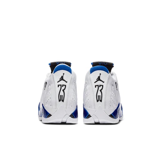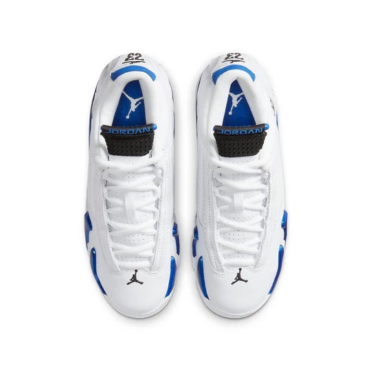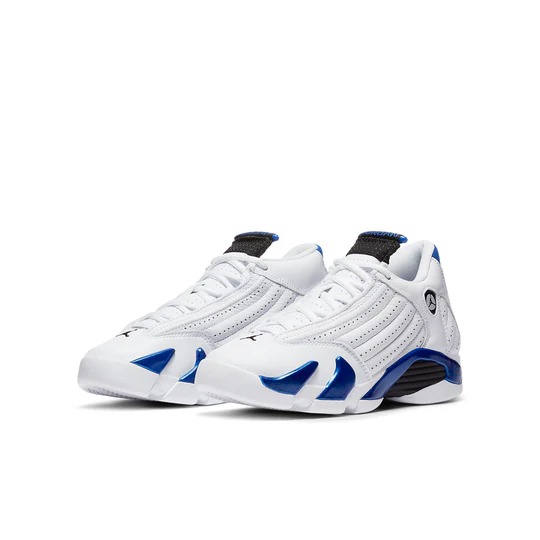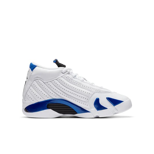 The (GS) Air Jordan 14 Retro ‘Hyper Royal’ 487524-104 (model number 487524) was released on September 19, 2020. This sneaker features a regular sole thickness and a leather upper for a premium look and feel. It uses a traditional lacing system and is built on a durable rubber sole. Designed as a high top with a round, it’s ideal for lifestyle wear. In terms of functionality, the shoe is cushioning, slip-resistant, wearable, making it suitable for every day wear all season. The main color is White, and the official colorway is White.