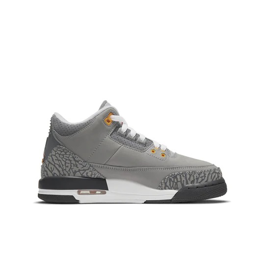 The (GS) Air Jordan 3 Retro ‘Cool Grey’ 2021 398614-012 (model number 398614) was released on February 20, 2021. This sneaker features a regular sole thickness and a leather upper for a premium look and feel. It uses a traditional lacing system and is built on a durable rubber sole. Designed as a high top with a round, it’s ideal for lifestyle wear. In terms of functionality, the shoe is cushioning, slip-resistant, wearable, lightweight, making it suitable for every day wear all season. The main color is Grey, and the official colorway is Silver/Light Graphite/Orange Peel/Sport Red.