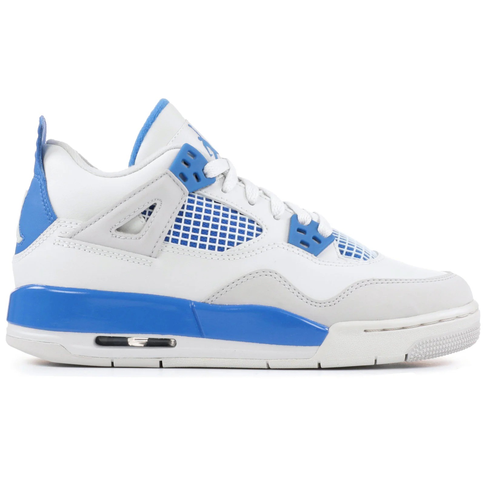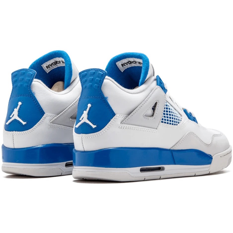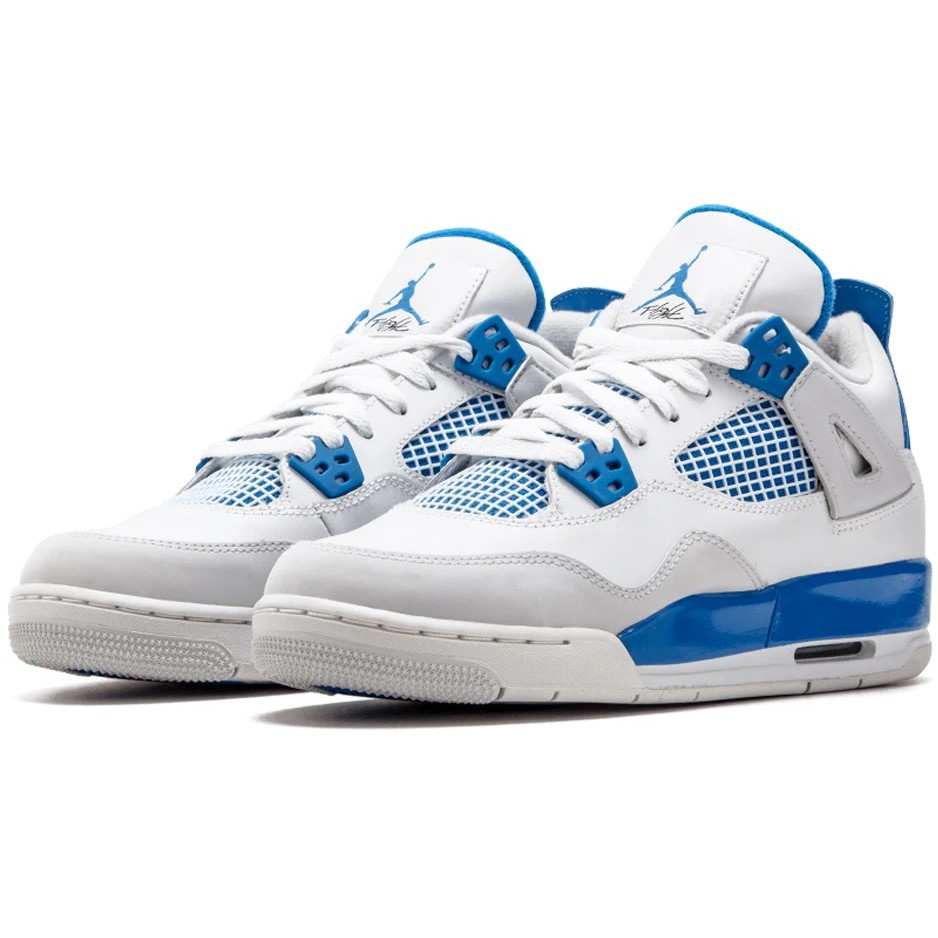The (GS) Air Jordan 4 Retro ‘Military Blue’ 2012 408452-105 (model number 408452) was released on November 01, 2017. This sneaker features a regular sole thickness and a leather upper for a premium look and feel. It uses a traditional lacing system and is built on a durable rubber sole. Designed as a high top with a round, it’s ideal for lifestyle wear. In terms of functionality, the shoe is slip-resistant, lightweight, making it suitable for every day wear all season. The main color is White, and the official colorway is White/Military Blue-Ntrl Grey.