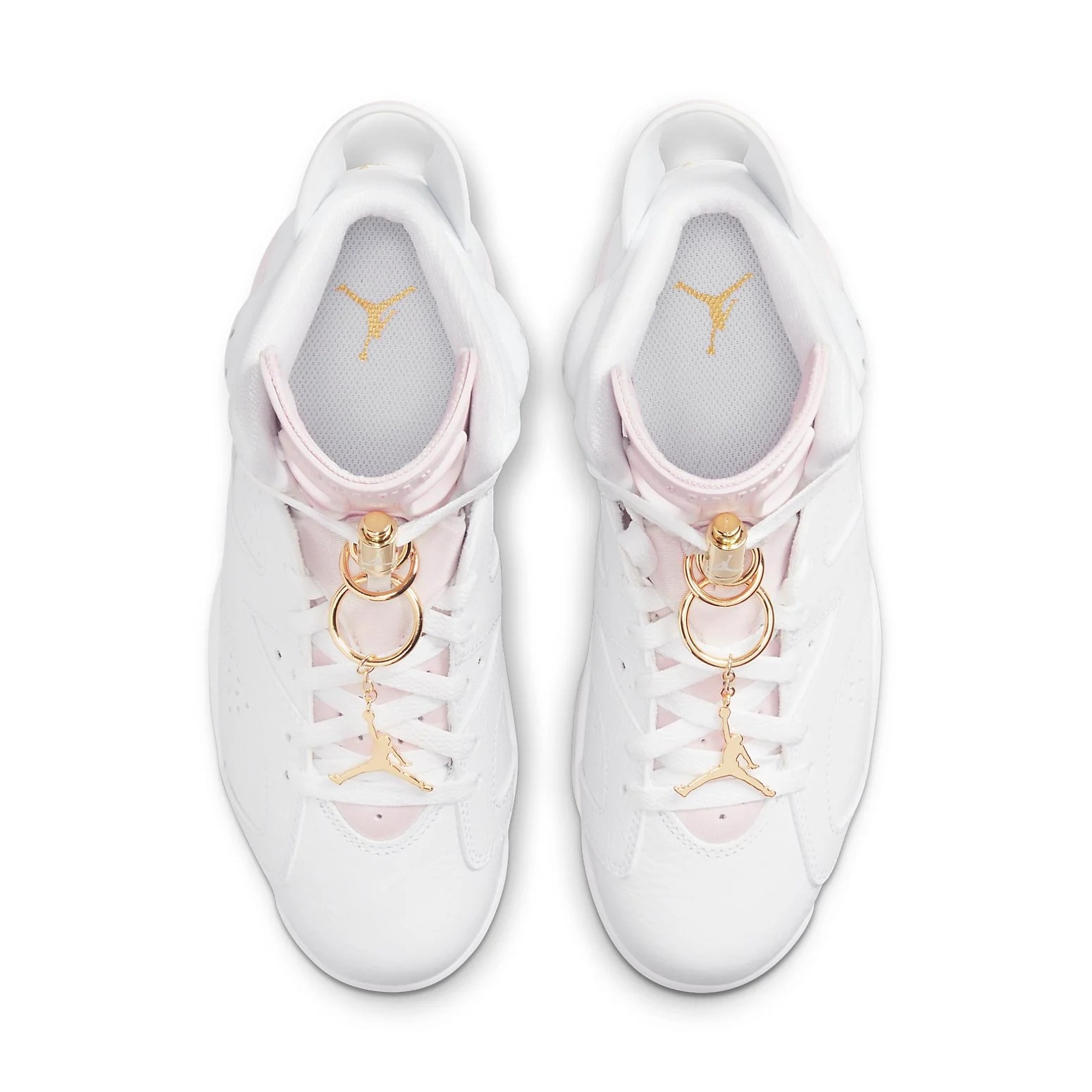 The (WMNS) Air Jordan 6 Retro ‘Gold Hoops’ DH9696-100 (model number DH9696) was released on June 30, 2021. Part of the Air Jordan 6 High series, this sneaker features a regular sole thickness and a leather upper for a premium look and feel. It uses a traditional lacing system and is built on a durable rubber sole. Designed as a high top with a round, it’s ideal for lifestyle wear. In terms of functionality, the shoe is cushioning, slip-resistant, wearable, wrapping, supportive, making it suitable for every day wear all season. The main color is White, and the official colorway is White/Sail/Metallic Gold/Barely Rose.